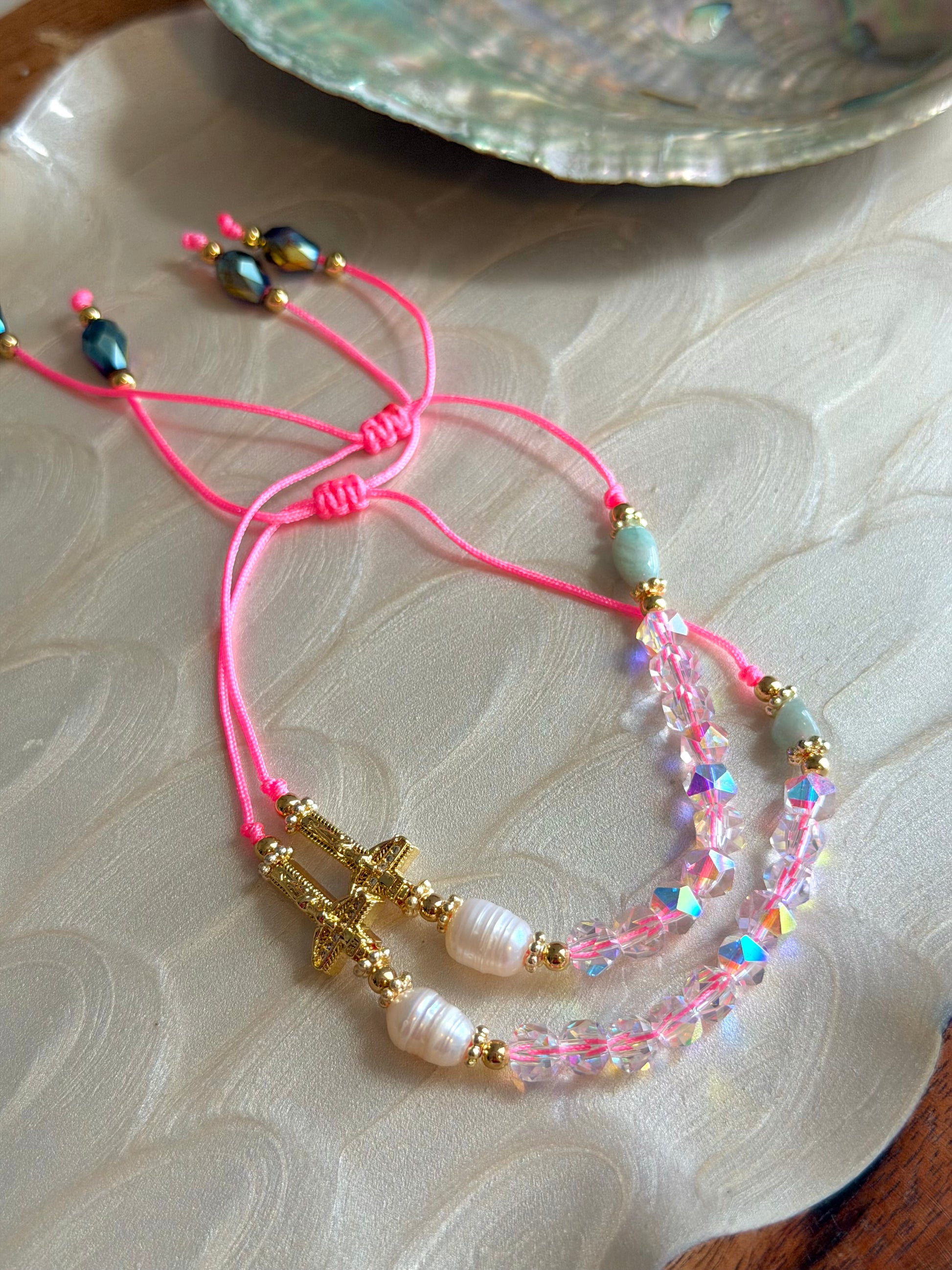 - Pulserita decenario en cristales, perla de agua dulce y detalles en oro laminado 18k.