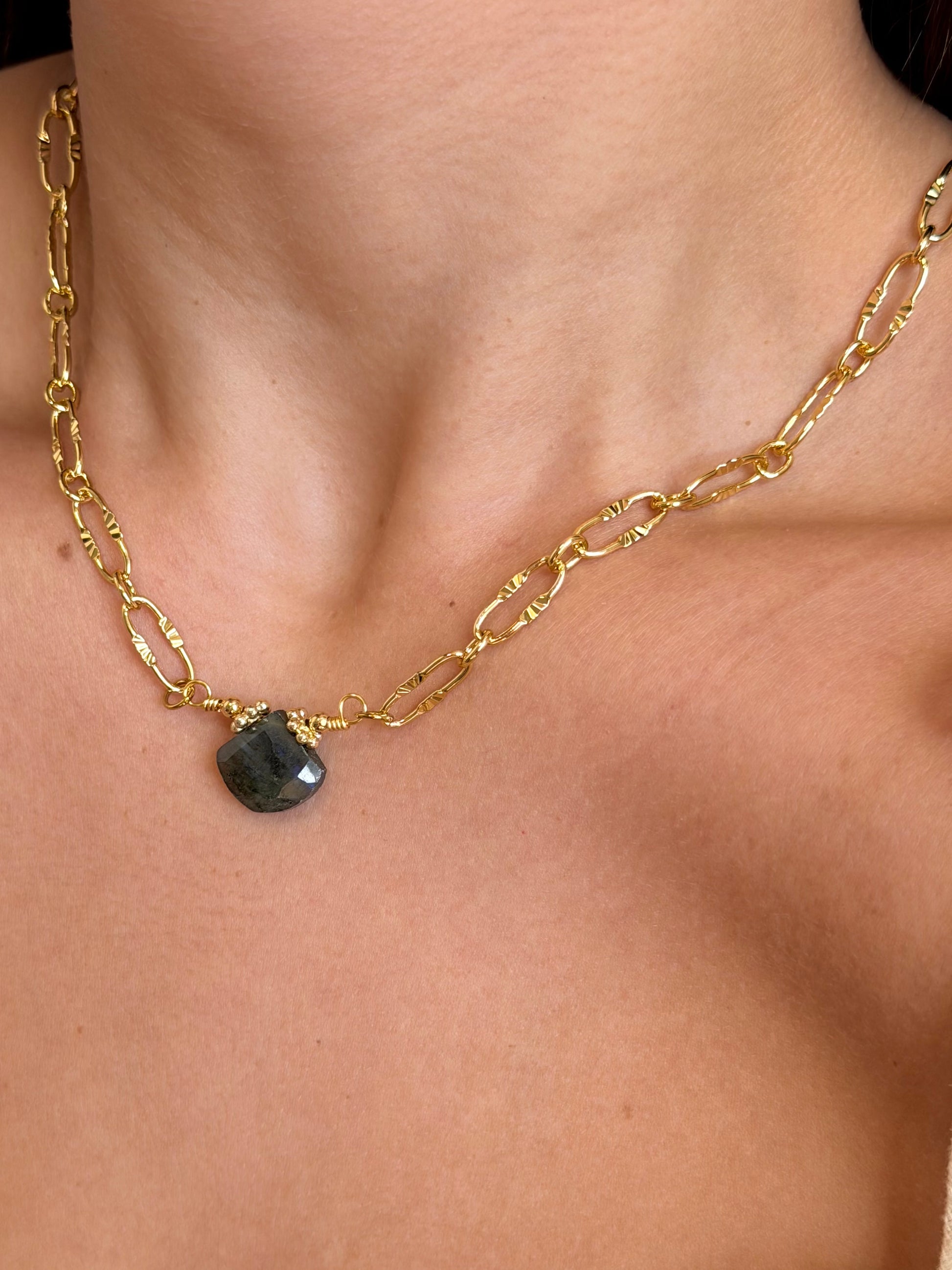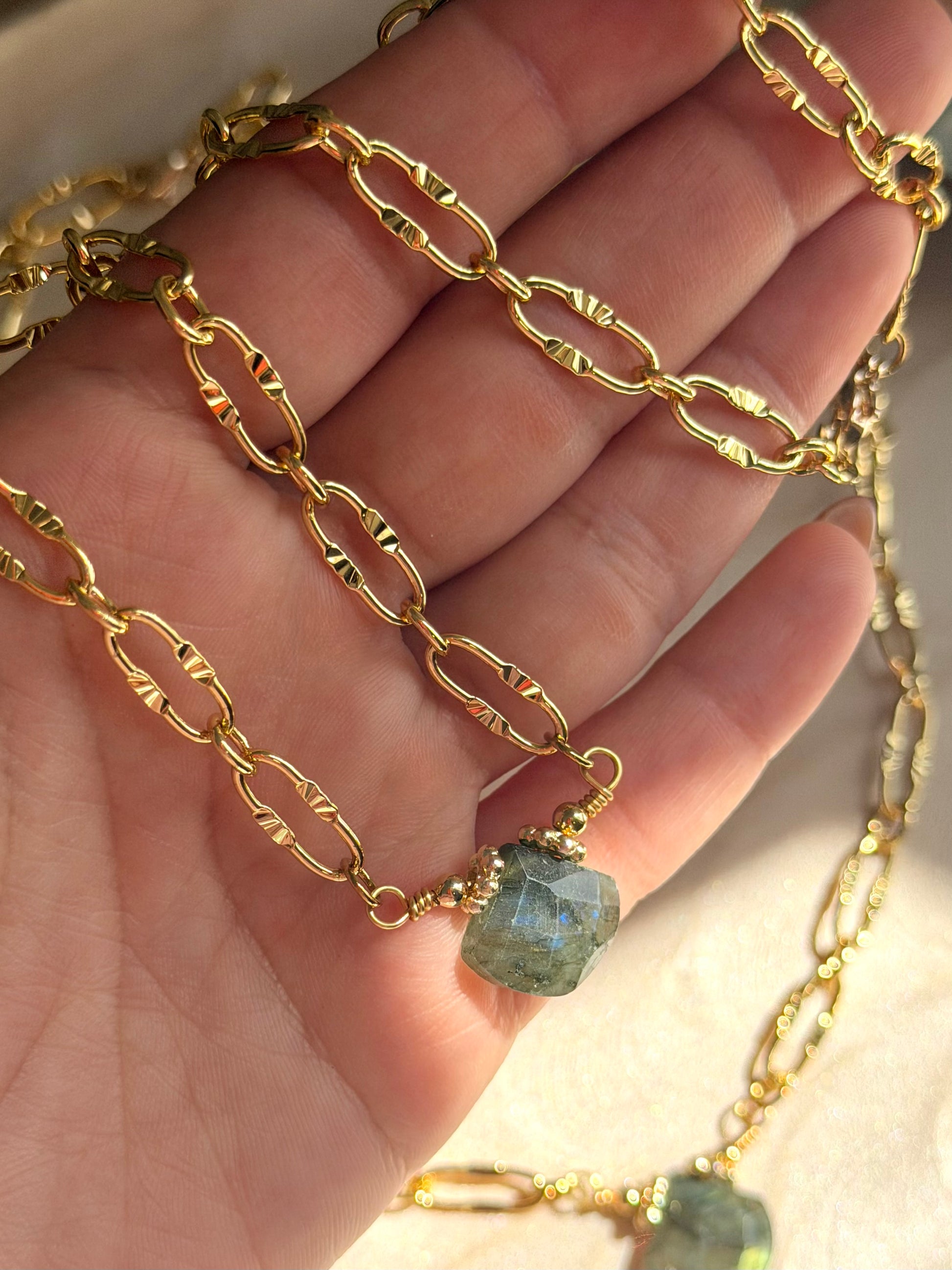 - Cadena enchapada en oro 18k con labradorita natural grado AAA.