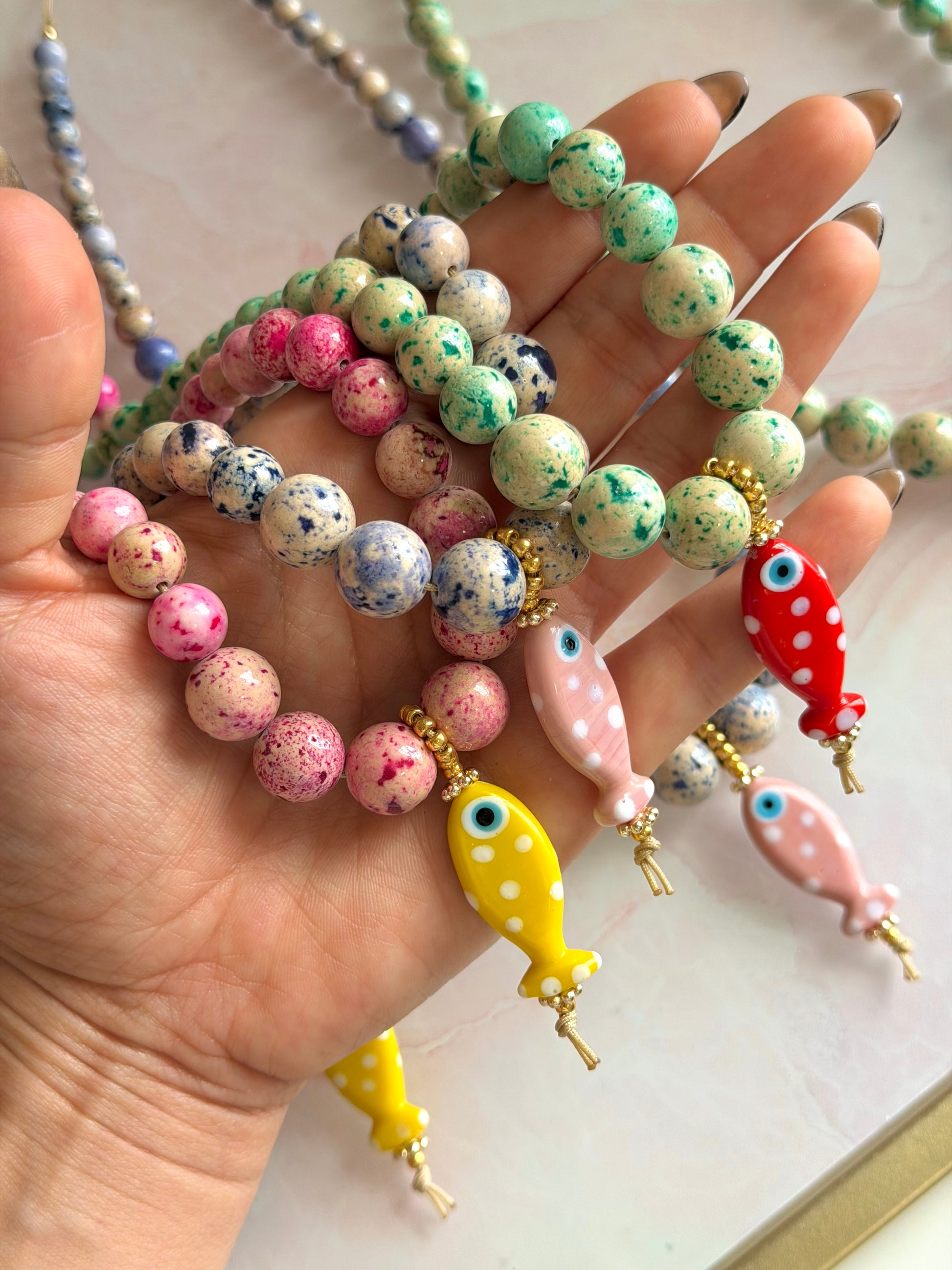 - Collar ajustable en hilo con piedra fósil y pez en cristal murano artesanal.